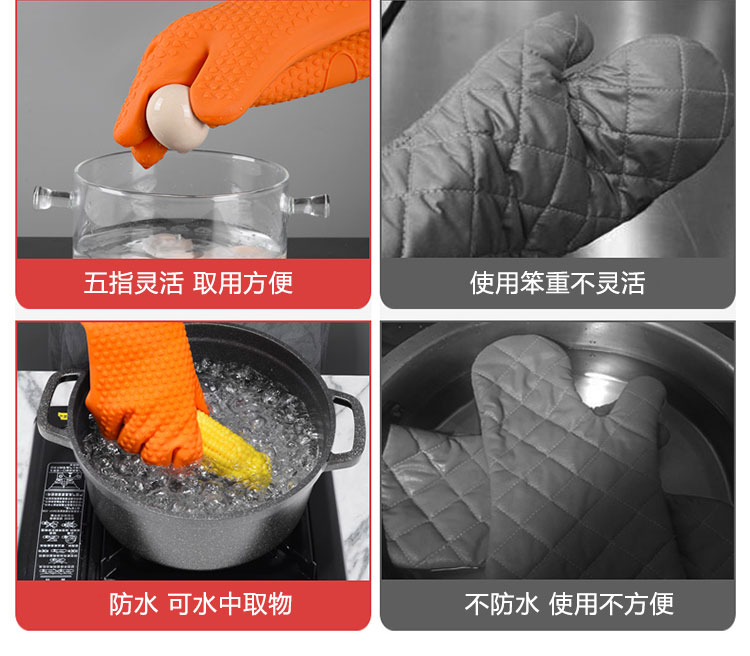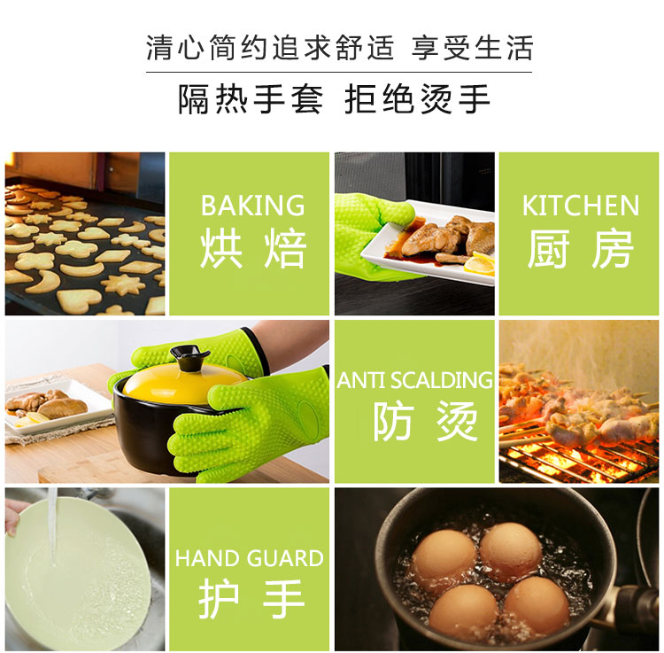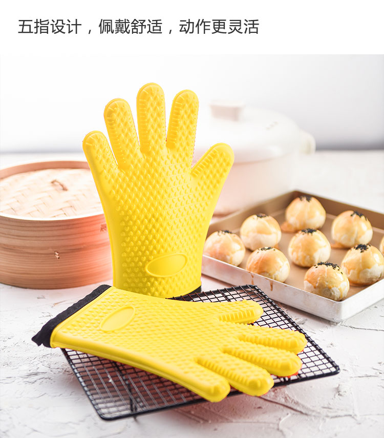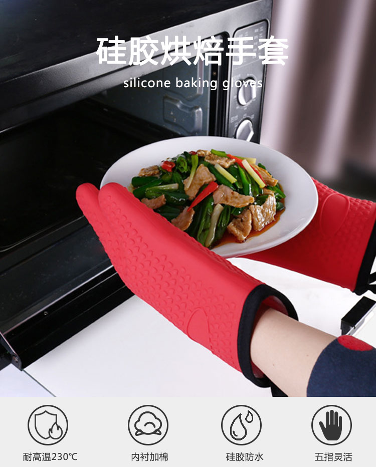硅膠烘焙手套質(zhì)地柔軟,分指設(shè)計,防滑防臟,內(nèi)置隔熱棉,有效保護(hù)雙手。